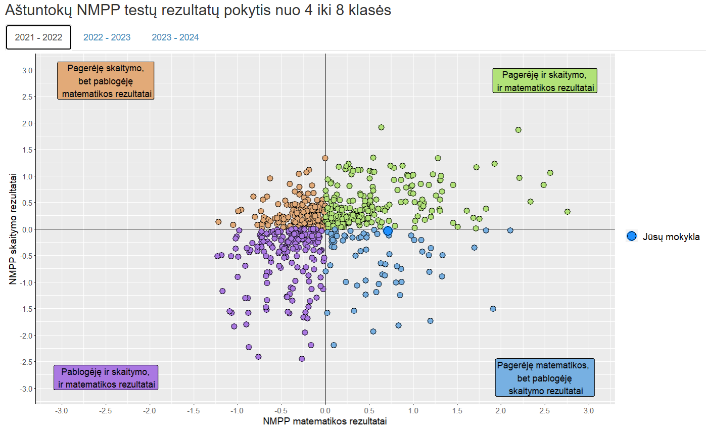 Lyginant mokinių pasiekimus skirtingais laikotarpiais, tampa akivaizdu, kokią įtaką turi įgyvendintos programos ir priemonės.
